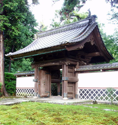 写真の山門は、新しい瓦屋根になっています。平成14年(2002)4月の改修前は、雨が降りはじめてもすぐには、山門の屋瓦根から雨滴が落ちては来ませんでした。それは、長年の風雨で瓦が苔生し、雨水を吸い込んでしまうような状況だったからです。